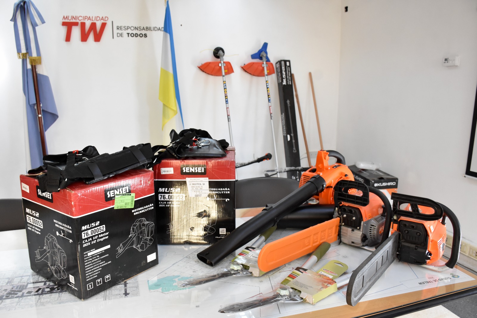 Entre los elementos incorporados se encuentran motoguadañas, sopladores, desmalezadoras, motosierras, tijeras de poda, palas, rastrillos, azadas, cepillos y otros insumos de uso operativo para el mantenimiento cotidiano de parques, boulevares, avenidas y accesos de la ciudad.