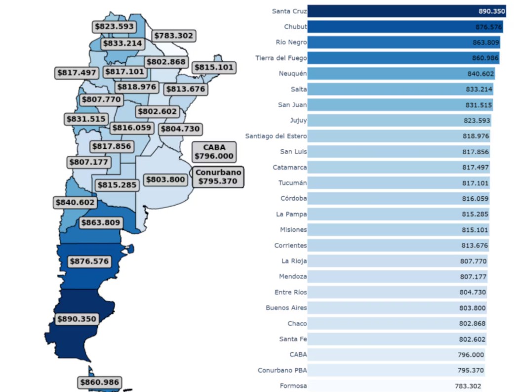 En el otro extremo, los lugares más económicos fueron Formosa ($783.302), Conurbano bonaerense ($795.370) y CABA ($796.000).