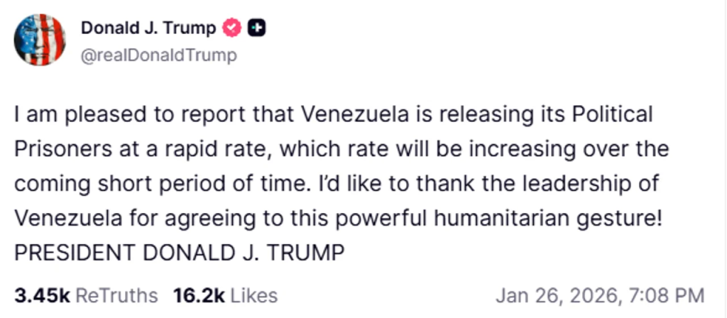 “Me complace informar que Venezuela está liberando a sus presos políticos a un ritmo acelerado, y se prevé que este ritmo aumente en las próximas semanas”, escribió Trump. Y agregó: “Quiero dar las gracias a los líderes de Venezuela por acceder a este importante gesto humanitario”.