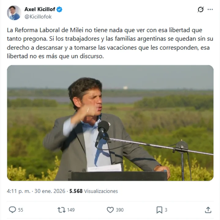 El gobernador bonaerense, Axel Kicillof, apuntó este viernes contra el proyecto de reforma laboral del presidente Javier Milei y afirmó que la iniciativa oficialista “no tiene nada que ver con esa libertad que tanto pregona”.