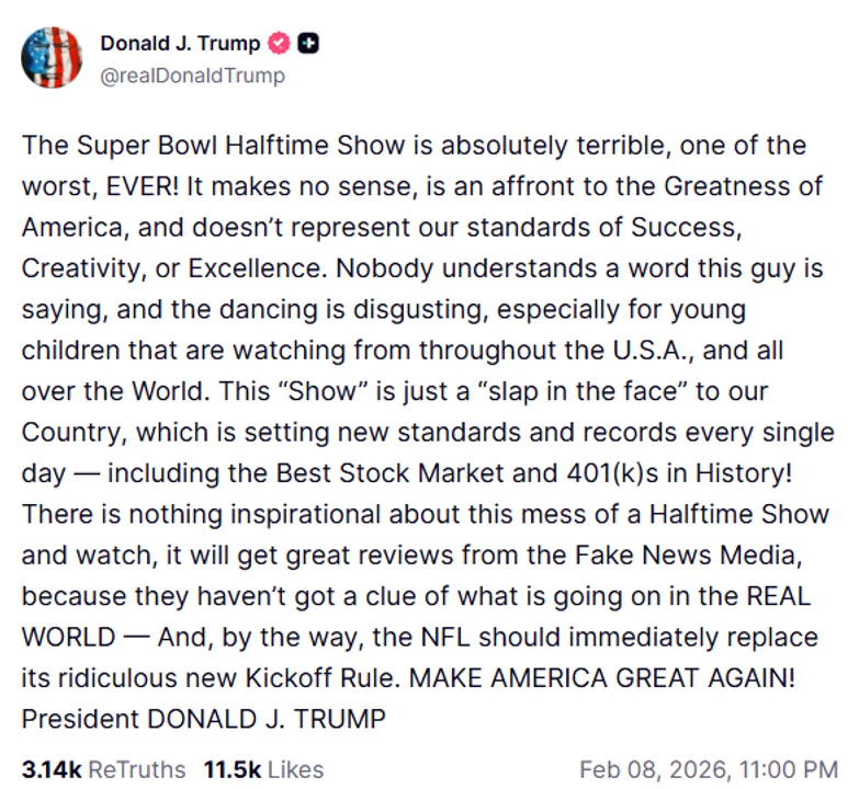 “¡El espectáculo del medio tiempo del Super Bowl es absolutamente terrible, uno de los peores de la historia!”, disparó Trump en su publicación.