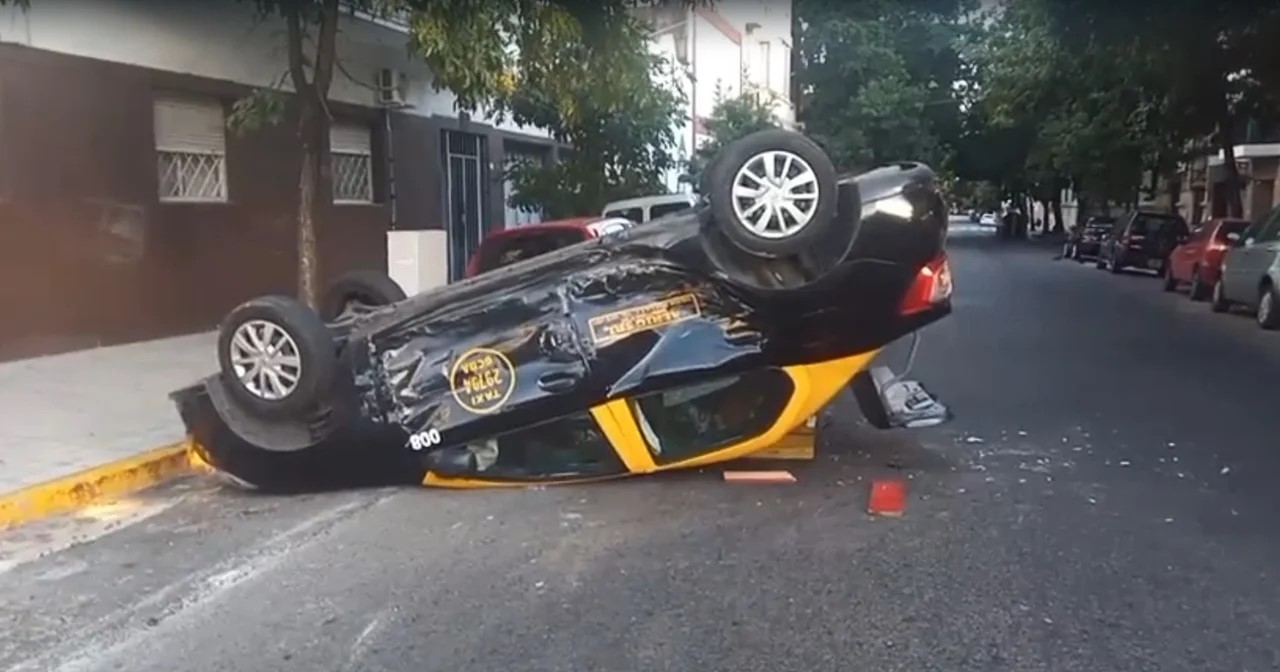 El auto Fiat Duna, que circulaba por la avenida, cruzó en rojo e impactó de lleno con el taxi, un Renault Logan, que iba por la calle Maza. Por consecuencia del choque, este último vehículo salió disparado y volcó sobre la calle.