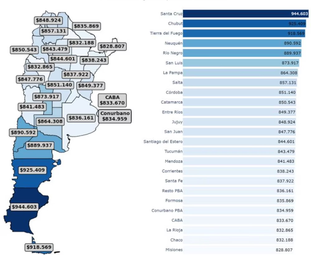 En el otro extremo, los valores más bajos se verificaron en La Rioja ($ 832.865), Chaco ($ 832.188) y Misiones ($ 828.807).
