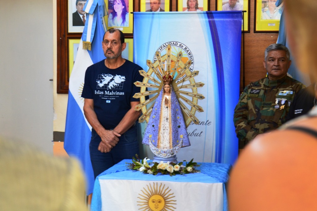 El concejal Monti brindo la bienvenida, agradeciendo la presencia del resto de sus pares, como de los acompañantes de la Virgen Malvinera, en especial destacando la presencia del Laico, Doronzono que tanta importancia tuvo en el proceso de repatriación de la virgen como esta etapa de peregrinación que la misma realiza, en este caso compartiendo el 44° aniversario de la gesta de Malvinas en la capital chubutense.