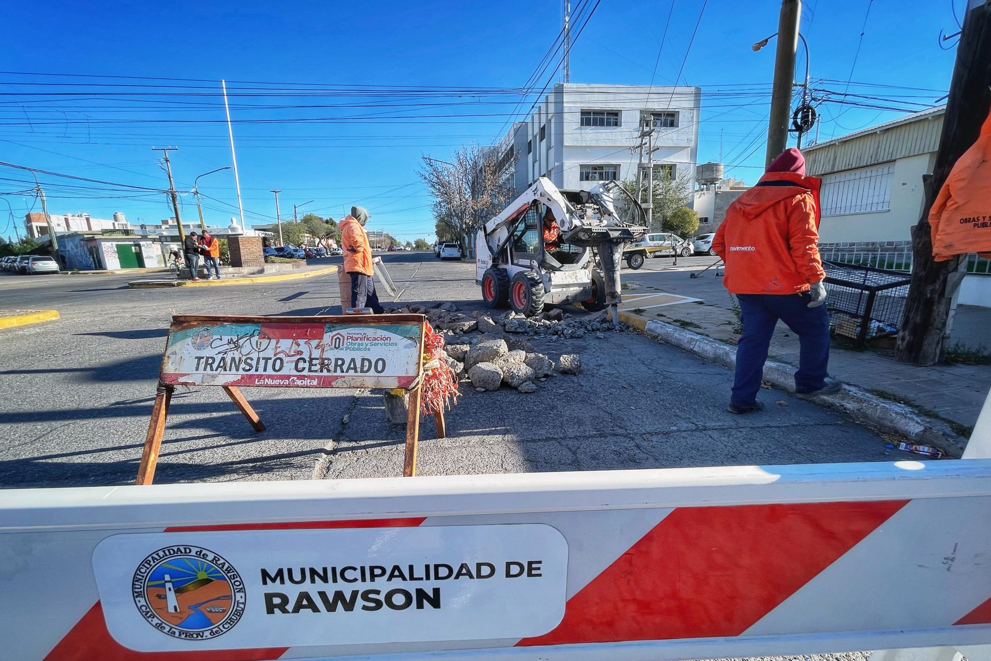 La Municipalidad de Rawson, a través de la Secretaría de Obras y Servicios Públicos, puso en marcha este viernes 17 de abril la repavimentación en la intersección de avenida 25 de Mayo y calle Belgrano. La intervención contempla la remoción y reemplazo de paños de hormigón dañados, en el marco de una planificación que se ejecuta por etapas.