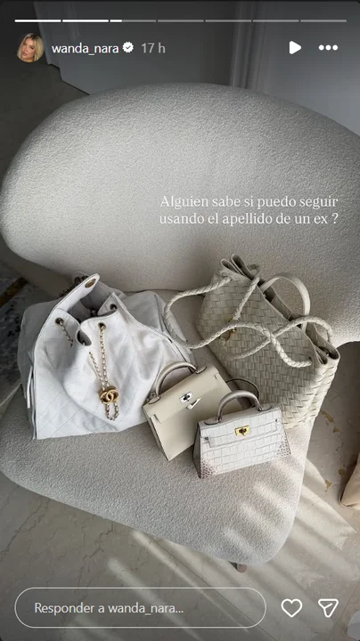 Sin embargo, la imagen que causó revuelo fue la de sus carteras, con una insólita pregunta a sus seguidores. “¿Alguien sabe si puedo seguir usando el apellido de un ex?”, escribió la mediática, en clara alusión a Mauro Icardi.