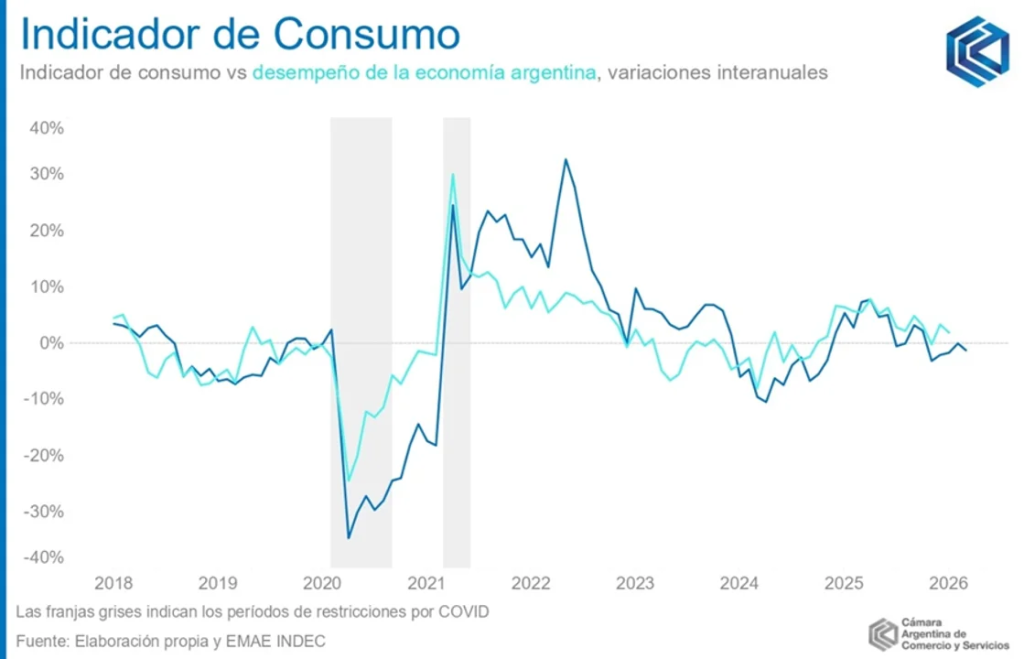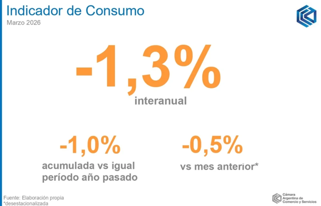 El Indicador de Consumo (IC) de la Cámara Argentina de Comercio y Servicios (CAC) registró en marzo una caída interanual del -1,3%, por debajo de la merma registrada en febrero, que había sido del -3,4%, de acuerdo con la evaluación del INDEC.