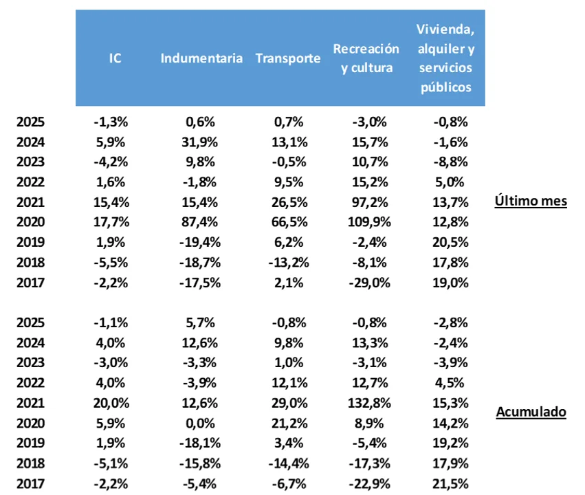 En cuanto al apartado de vivienda, alquileres y servicios públicos, este mostró un decrecimiento estimado de -0,8% en marzo respecto al mismo mes de 2025, aportando -0,1 p.p. a la caída del índice general.