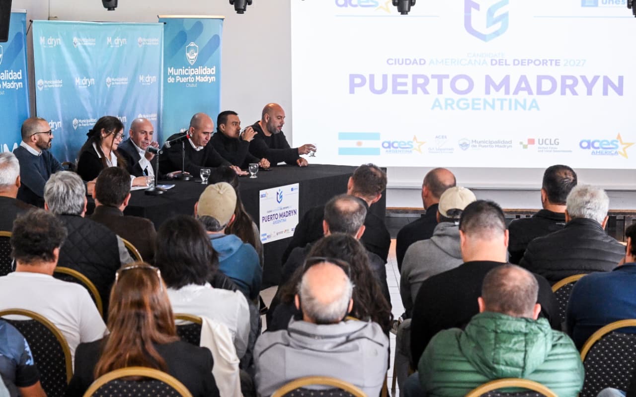 El intendente de Puerto Madryn, Gustavo Sastre, encabezó esta mañana el acto en el que se oficializó la candidatura de Puerto Madryn como Ciudad Americana del Deporte 2027, en el marco de las distintas acciones que impulsa la fundación ACES, que aborda estas temáticas en todo el mundo.